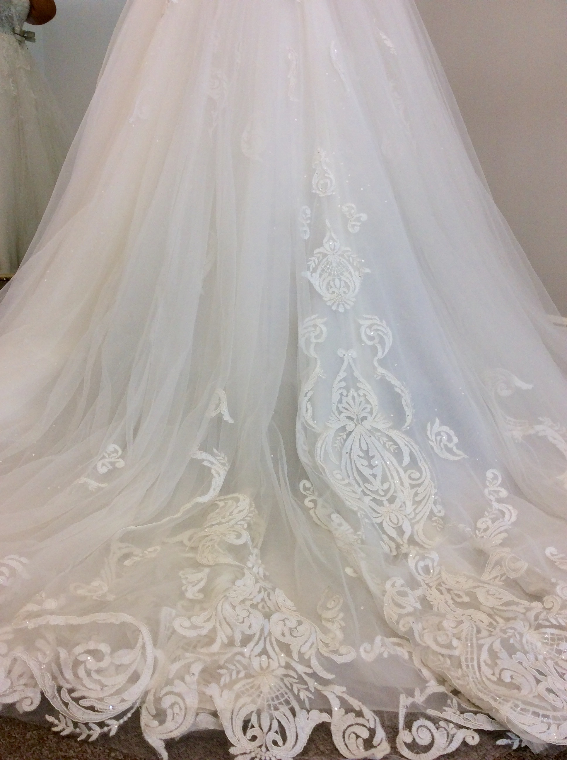 Divine Detailing From Head to Toe With a whole underlay of clear sequins this gown certainly shines! Towards the end of the train the appliques begin to thicken with lattice work detailing. We are big fans of that checker boarding action!